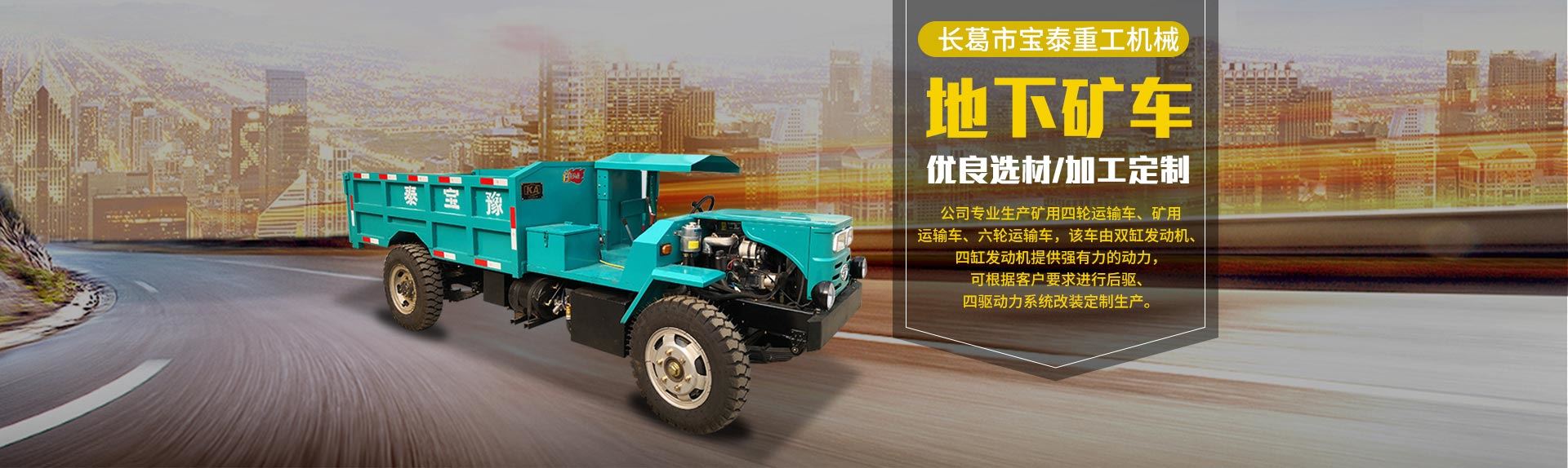 長葛市寶泰重工機械有限公司坐落于全國百強縣(市)——長葛市。南接魏都許昌,北依省會鄭州,距新鄭國際機場二十六公里,107國道與京珠高速從公司左右穿過。得天獨厚的交通環境為有識之士來公司指導合作提供了便利條件。 公司專注生產礦用四輪運輸車、礦用運輸車、六輪運輸車,該車由雙缸發動機、四缸發動機提供強有力的動力,該產品適應巷道、隧道、平原、山區、工地各種道路,通過能力強,運載馬力大,質量可靠,可根據客戶要求進行后驅、四驅動力系統改裝定制生產,深受各類礦山實...